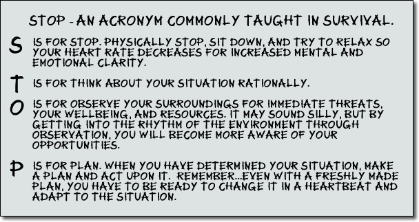 By frequently "STOP"ping and reassessing your situation, you will help keep your mind and body actively engaged in surviving. This will greatly help you to keep a positive state of mind, to avoid panicking and to improve your chances of survival.